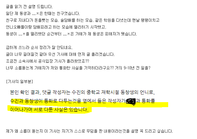 (여자)아이들 수진 관련 게시글에 대해 본인 확인 결과,댓글 작성자는 수진의 중학교 재학시절 동창생의 언니로,